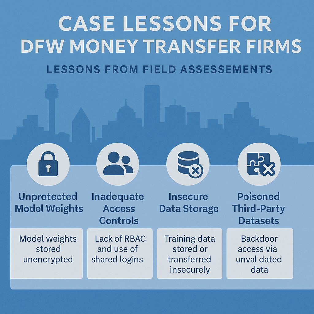 At CyberCile, we’ve assessed AI/ML deployments across financial services — including firms right here in Dallas–Fort Worth. Too often, money transmitters adopt AI for fraud detection or compliance monitoring but overlook basic security. Here are real-world lessons that apply directly to MSBs in our region: