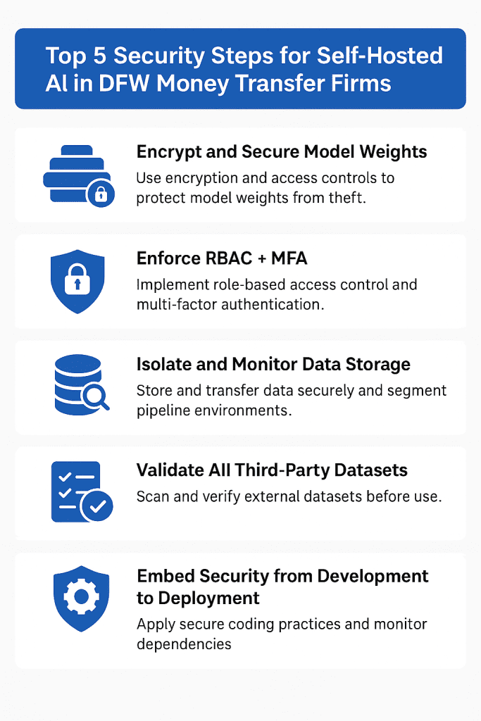For MSBs in Dallas–Fort Worth, self-hosted AI/ML pipelines are powerful — but they must be hardened to protect: